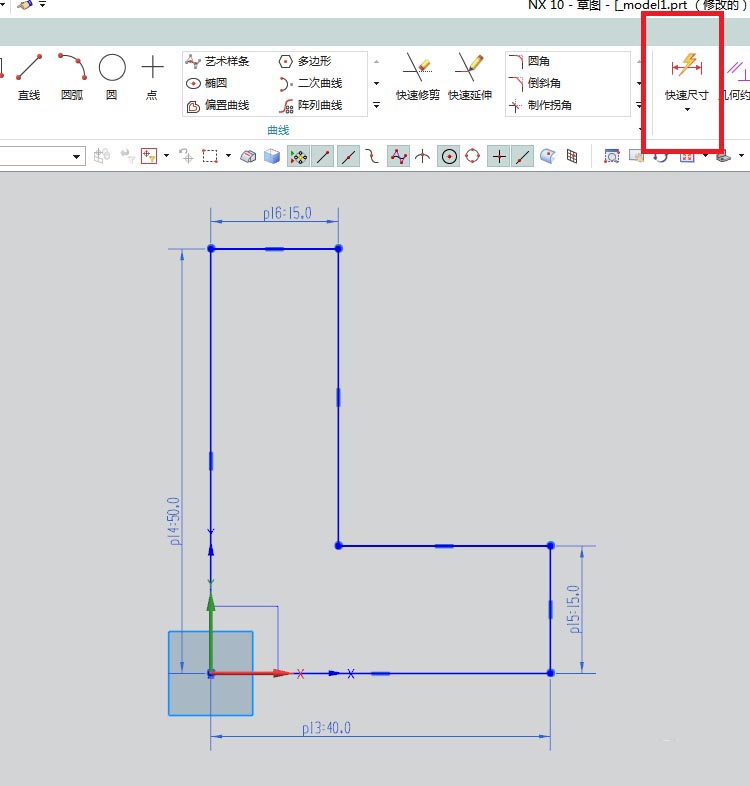 4、如下图所示,点击草图工具栏中的“快速尺寸”命令,按照下图尺寸标注,50、40、15、15,共四个尺寸。
