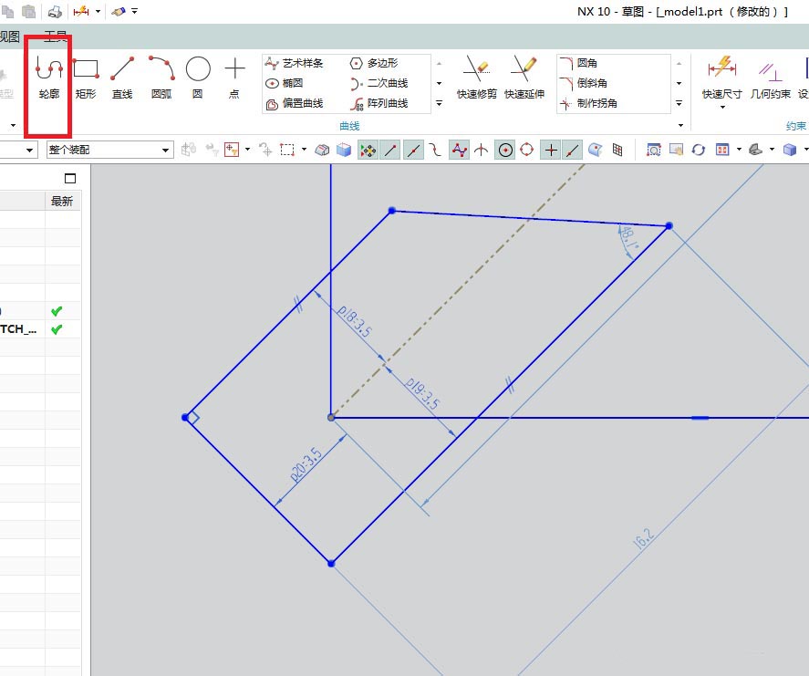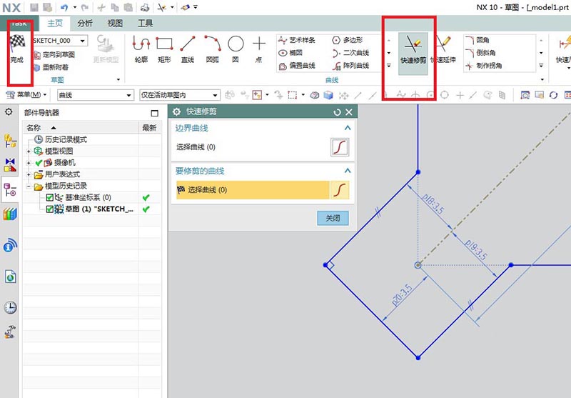 7、如下图所示,点击工具栏中的“快速修剪”命令,按照下图,将多余的线段修剪掉,点击完成,退出草图。