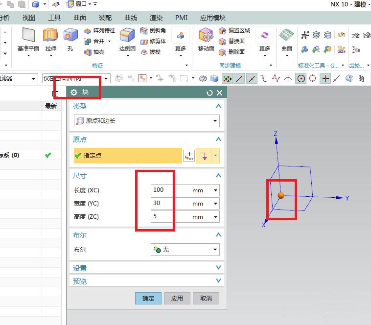 2、如下图所示,执行【菜单——插入——设计特征——长方体】,激活长方体命令,设置长度100,宽度30,高度5,原点默认,点击确定。