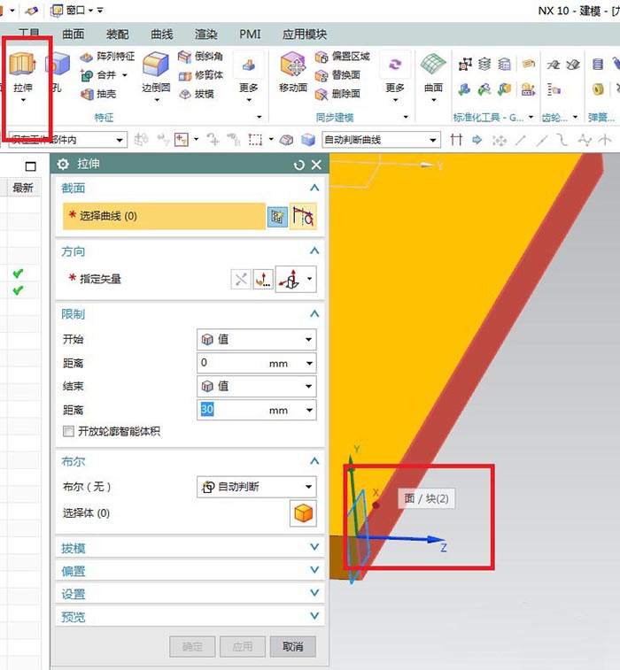 11、如下图所示,点击工具栏中的“拉伸”图标,激活拉伸命令,点击下图中的实体上红色的平面,然后就能直接进入草图。