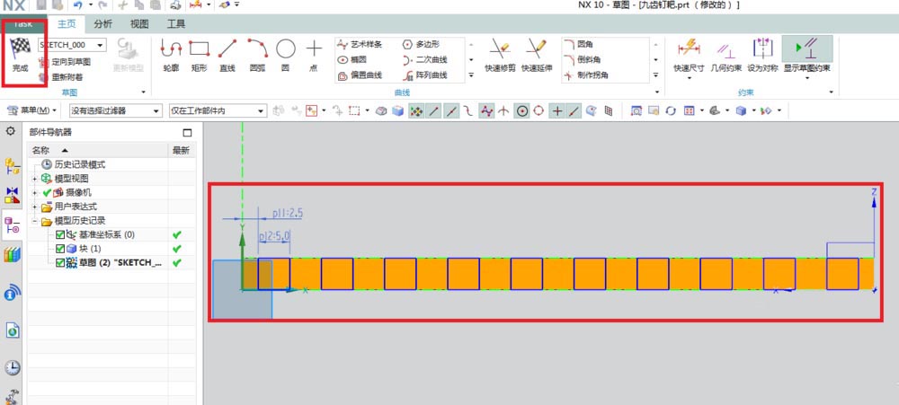 4、如下图所示,进入草图,激活矩形命令,画一个矩形,激活快速尺寸命令,标注尺寸2.5和5,激活阵列曲线命令,线性阵列,数量10个,均布,点击完成,退出草图。
