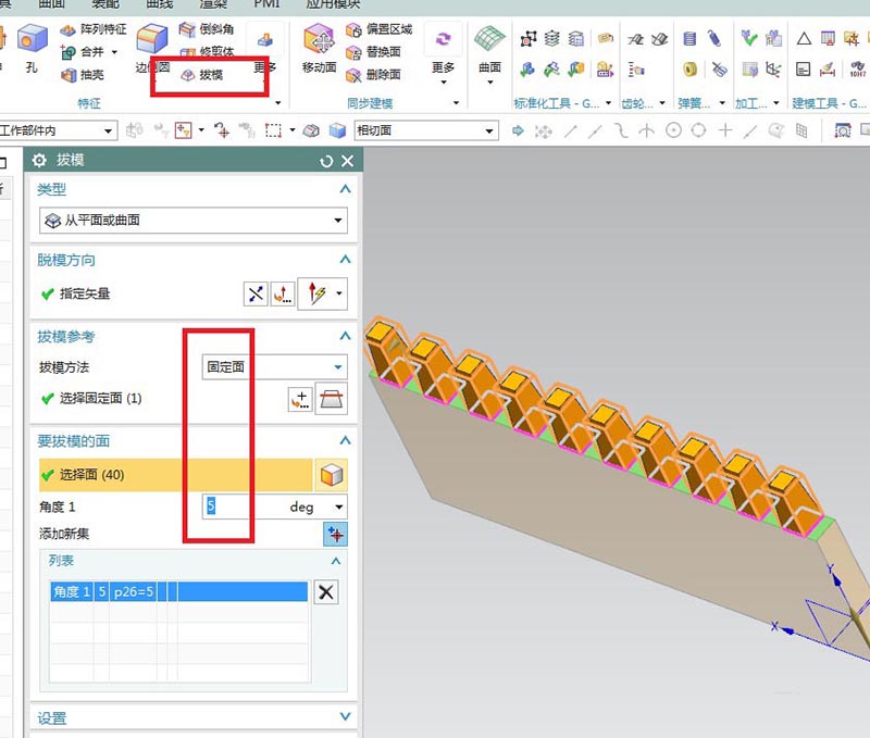 6、如下图所示,点击工具栏中的拔模命令,拔模方法选择固定面,拔模方向指定矢量Y轴,固定面为下图中的绿色平面,要拔模的面选择10个拉伸长方体的四个面,角度5,点击确定。