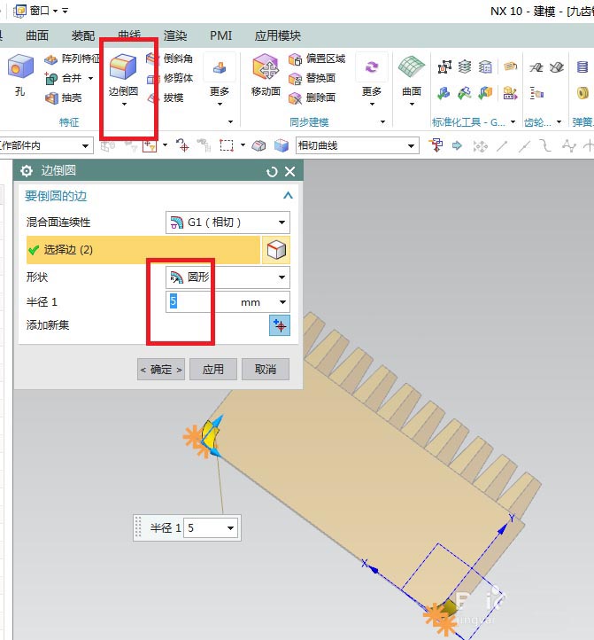 7、如下图所示,激活工具栏中的边倒圆命令,对话框中设置半径为5,实体中选择两个边线,点击应用。