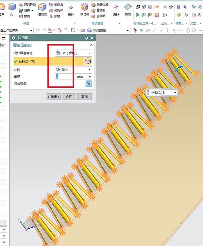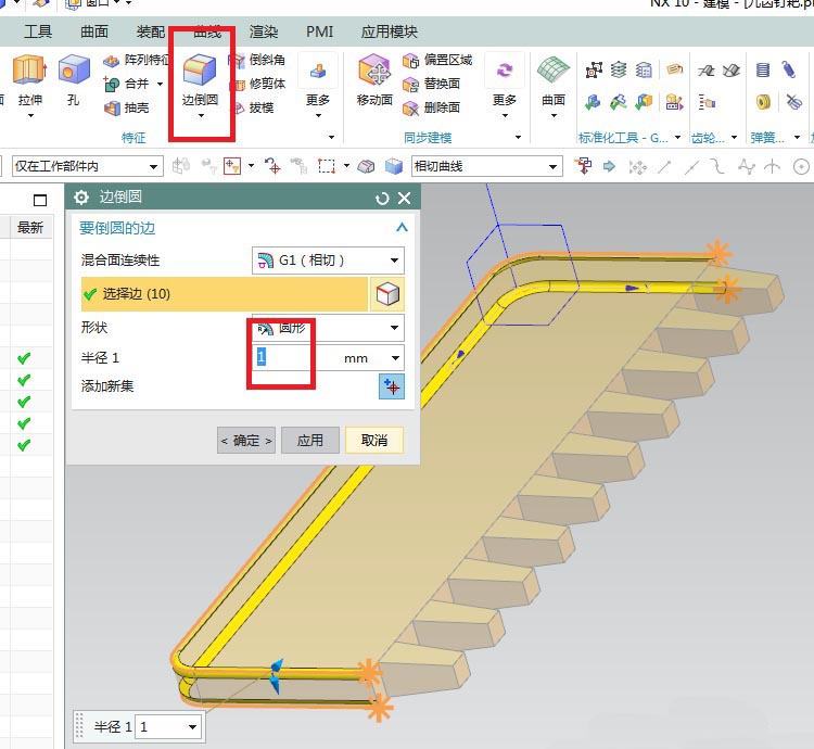 9、如下图所示,半径不用改,选择10个拔模生成的棱台的四条边,点击应用。
