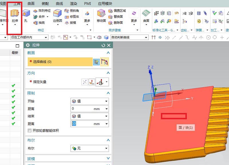 3、如下图所示,点击工具栏中的 拉伸命令,点击实体中红色平面,不会找就,见下图。