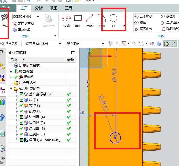 12、如下图所示,进入草图,激活圆命令,画一个圆,双击修改直径ø6,快速尺寸标注15、50,点击完成,退出草图。