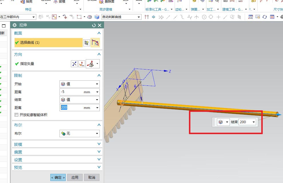 13、如下图所示,设置拉伸高度为:-5开始,200结束,点确定。