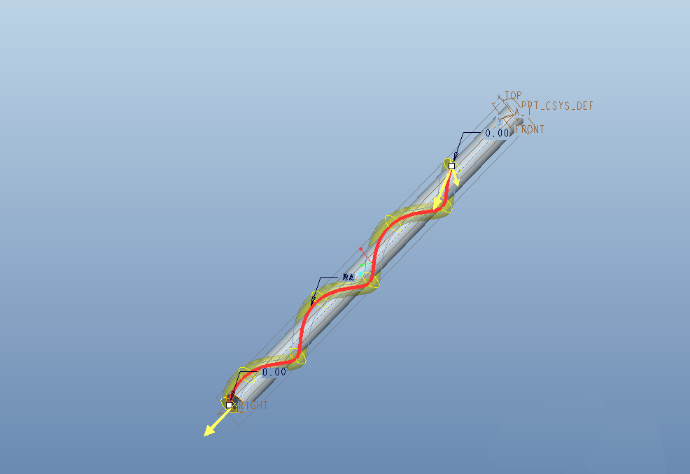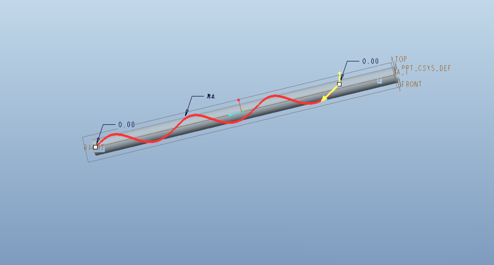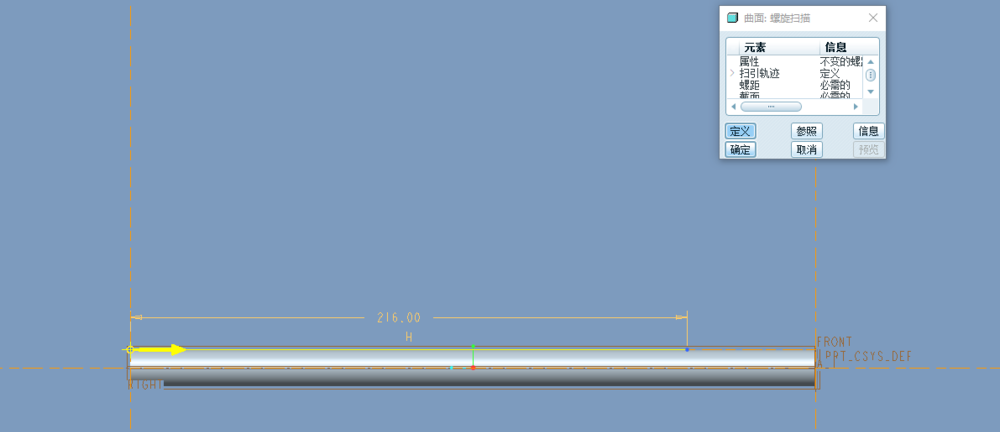 1、点击拉伸,在FRONT平面创建一个直径为14,长度为266的圆柱。