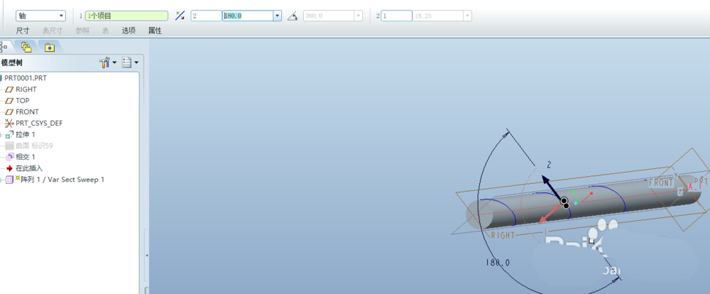11、选择上面的可变截面扫描特征,点击【阵列】,类型为【轴】,阵列个数为2,阵列成员的角度为180.