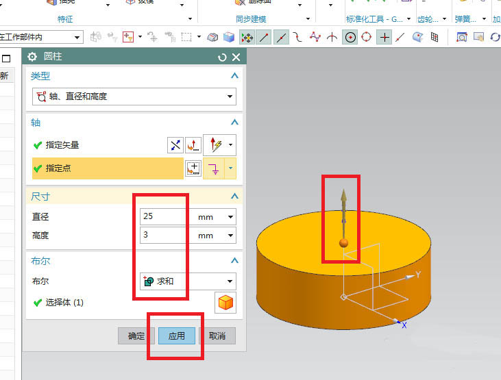 3、如下图所示,默认矢量,指定点:0,0,10,设置尺寸:直径25,高度3,布尔求和,点击“应用”。