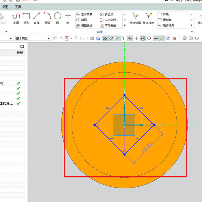 11、如下图所示,点击工具栏中拉伸命令,在出现拉伸对话框之后,点击红色框选所在的实体红色平面,直接进入草图。
