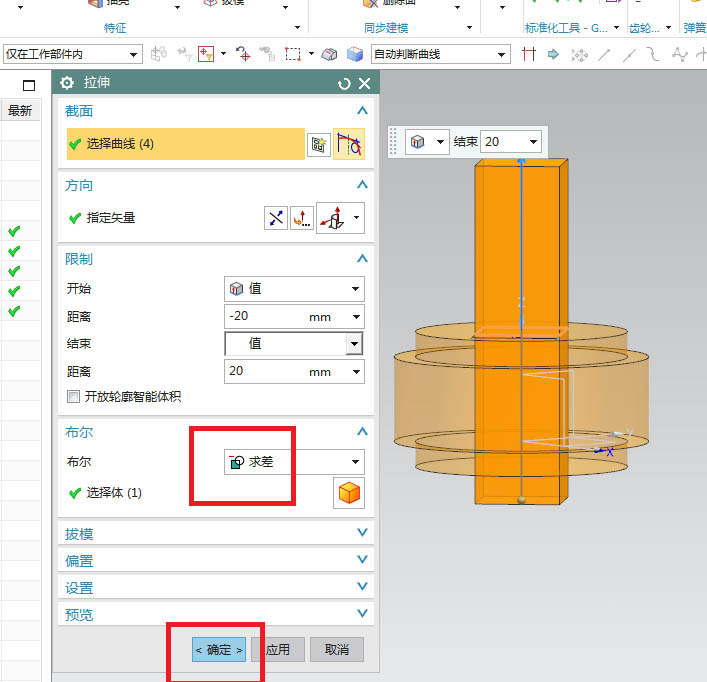 7、如下图所示,默认的限制尺寸可以不用改,布尔求差,点击确定,一个方孔就创建完成了。