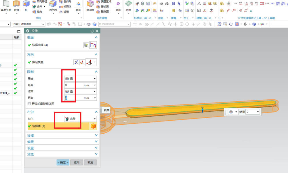 13、如下图所示,设置限制,从0开始,2结束,布尔求差,点击确定。