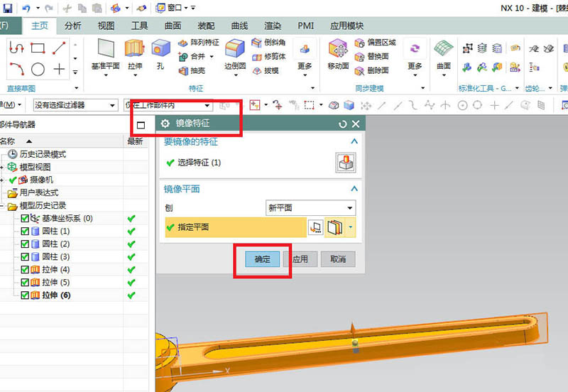 14、如下图所示,更多——镜像特征,选择刚刚的拉伸特征,选择新平面,点击实体的上下两个平面,自动取中间平面,点击确定。