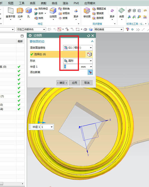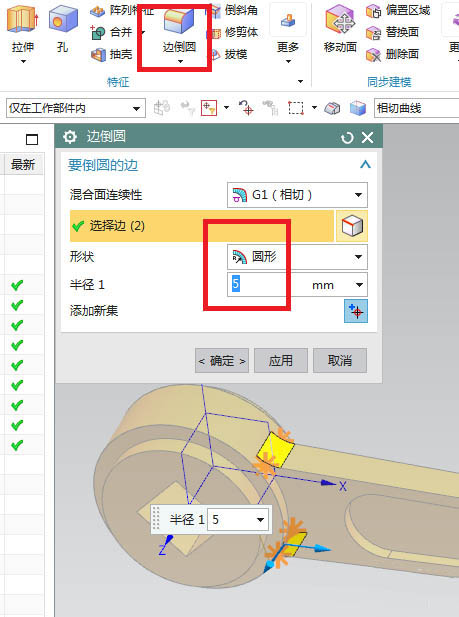 16、如下图所示,点击工具栏中的边倒圆,对话框中设置半径5,点击实体中的两个实体边线,点击确定。