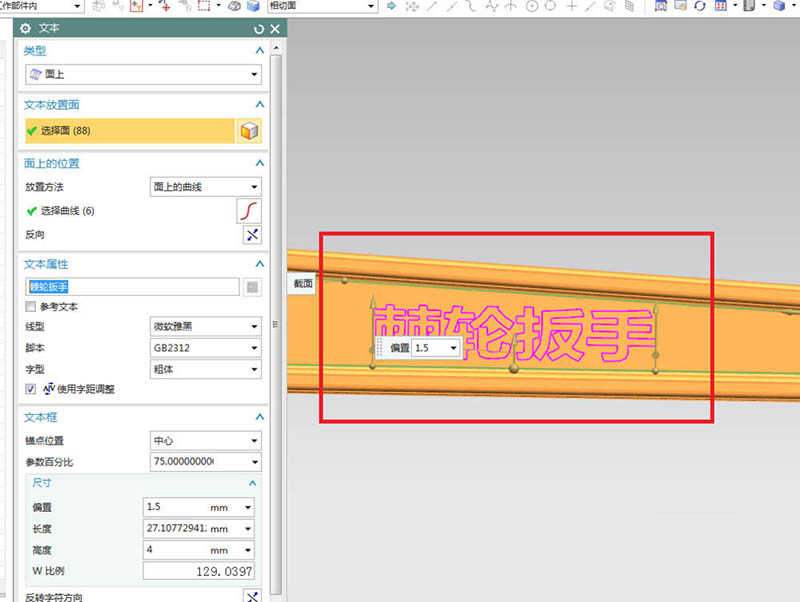 19、如下图所示,在曲线工具栏中点击”文本“,然后选择放置文本的平面以及曲线,然后输入文本属性“棘轮扳手”,然后线型“微软雅黑”,然后手动调整文字的大致位置,对话框中输入参数、调整文字的大小、位置,最后满意了再点击确定。