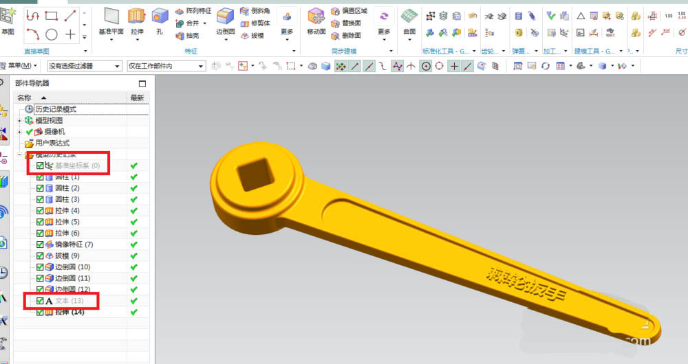 21、如下图所示,在部件导航器中将基准坐标系和文本隐藏好,将显示改成着色。