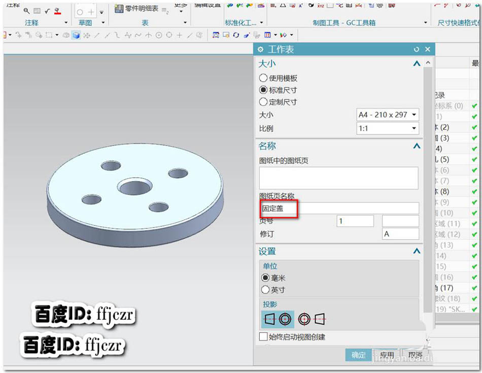 6、点选新建图纸面,在弹出的对话框中更好相应的名称。将部件的各视图投影到工程图中,进行工程图相应的操作,得到该部件的工程图。
