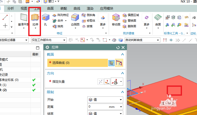 4、如下图所示,点击工具栏中的拉伸图标,点击实体中最上面的平面。