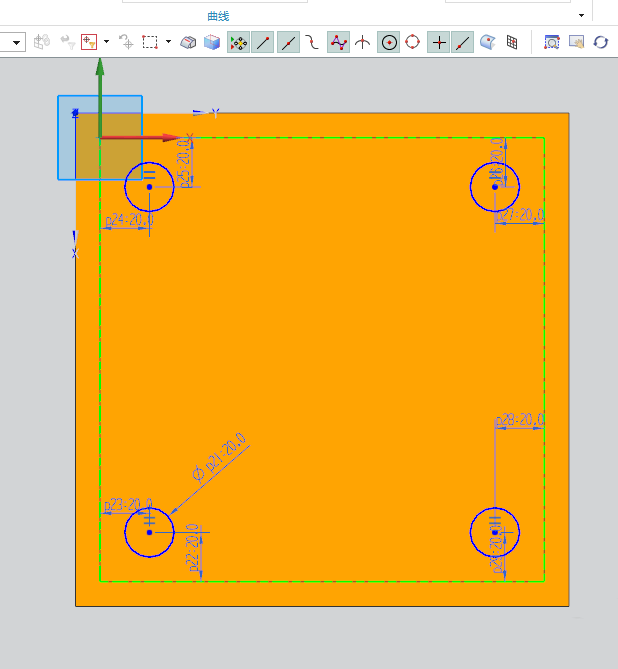 5、如下图所示,进入草图,激活圆命令,画四个圆,添加几何约束,四个圆等径,激活快速尺寸命令,标注尺寸,圆心距离边线20,圆直径ø20,点击完成,退出草图。