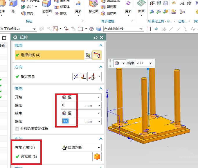 6、如下图所示,回到拉伸对话框,设置限制,从0开始,200结束,布尔求和,点击确定。