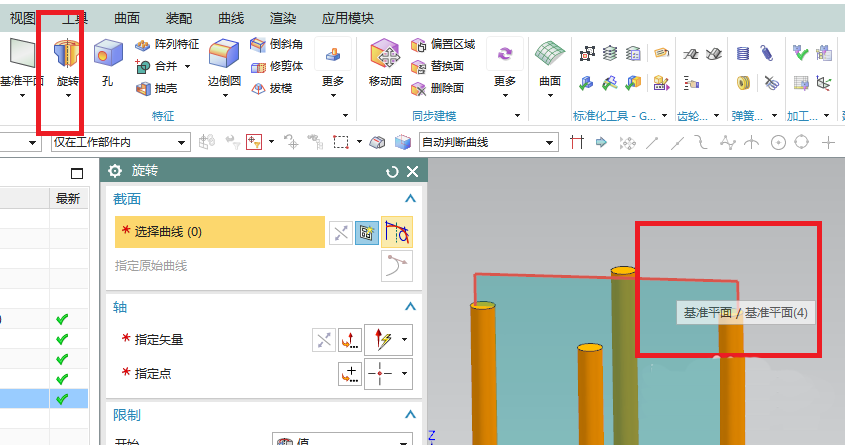 8、如下图所示,点击工具栏中的旋转图标,点击新建的基准平面,直接进入到草图环境。