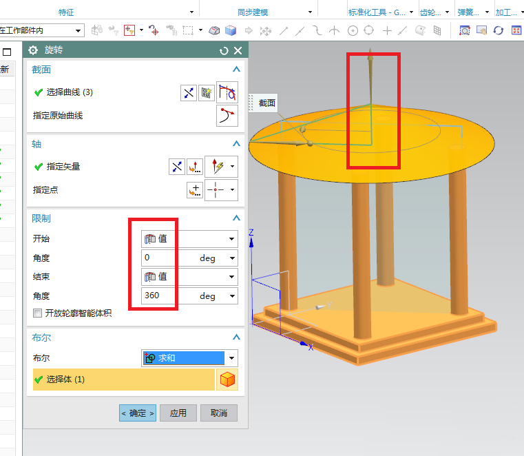 10、如下图所示,回到旋转对话框旋转轴选择Z轴,布尔求和,点击确定。
