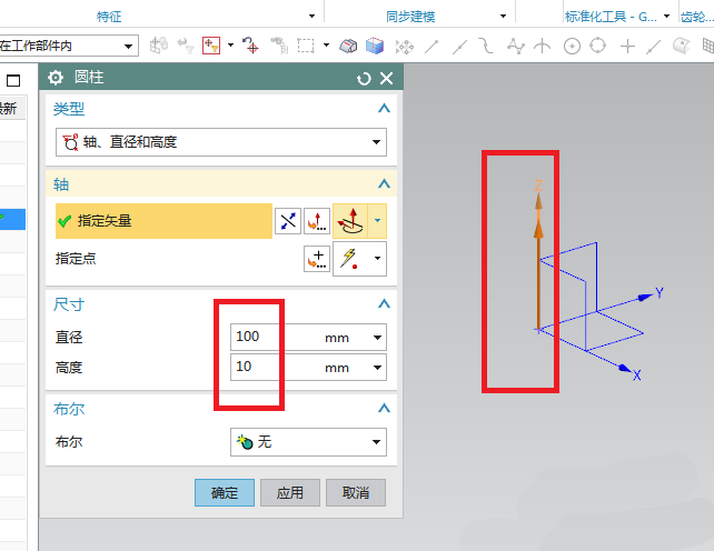 2、如下图所示,执行【菜单——插入——设计特征——圆柱体】,指定矢量Z轴,设置尺寸:直径100,高度10,点击“应用”。