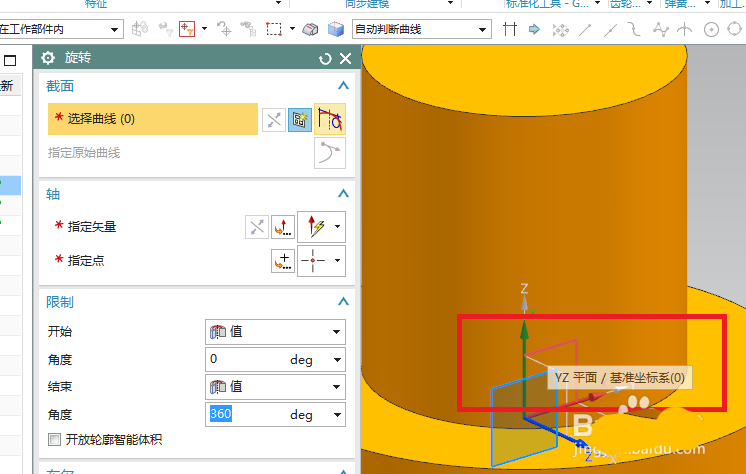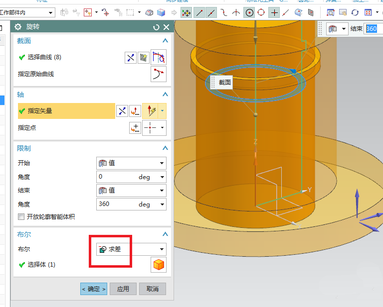 6、如下图所示,回到旋转对话框,指定矢量Z轴,布尔求差,点击确定。