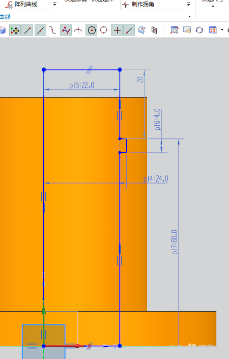 5、如下图所示,进入草图,激活轮廓命令,画一个封闭的图形,添加几何约束,左边竖直边线与纵轴重合,下边线与横轴重合,右边两端竖直线重合,激活快速尺寸命令,标注尺寸22.0、24.0、60.0、4.0,点击完成,退出草图。