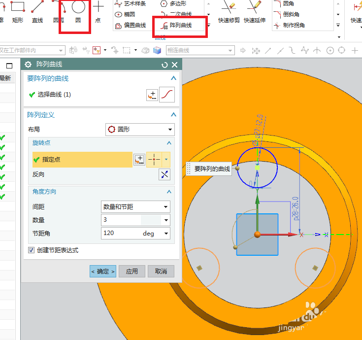 9、如下图所示,激活圆命令,双击修改圆直径ø12.0,激活快速尺寸命令,标注尺寸26.0,激活阵列曲线,圆形布局,指定点坐标原点,数量3,节距角120,点击完成,退出草图。