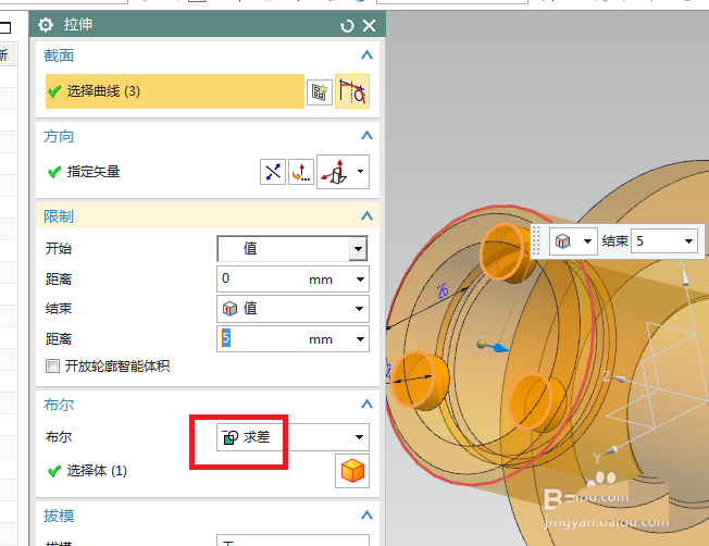 10、如下图所示,设置限制,0开始,5结束,布尔求差,点击确定。