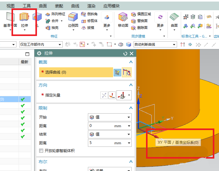 11、如下图所示,点击工具栏中的拉伸图标,点击基准坐标系中的XY平面。