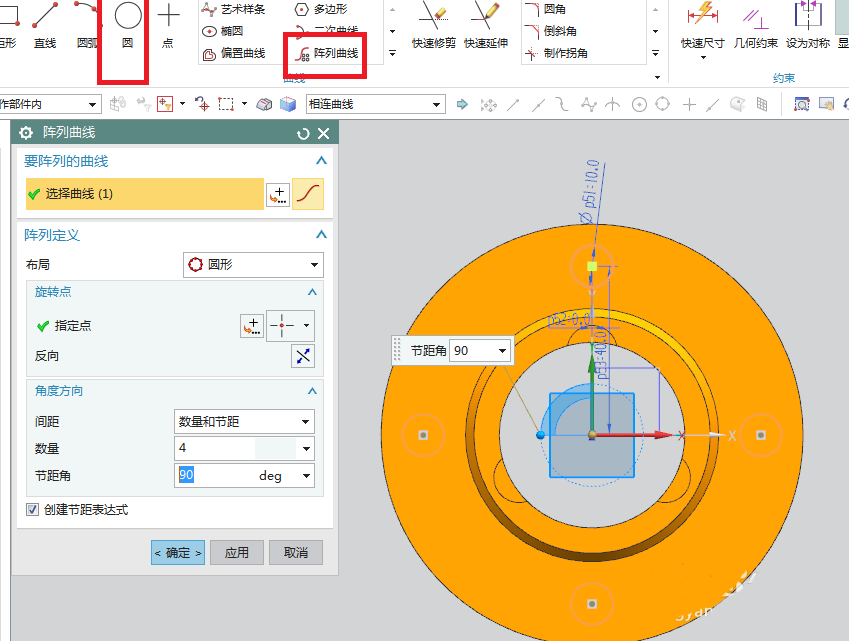 12、如下图所示,激活圆命令,在纵轴上画一个圆,双击修改圆直径为ø10.0,激活阵列曲线,圆形布局,指定点坐标原点,数量4,节距角90,点击确定,点击完成,退出草图。