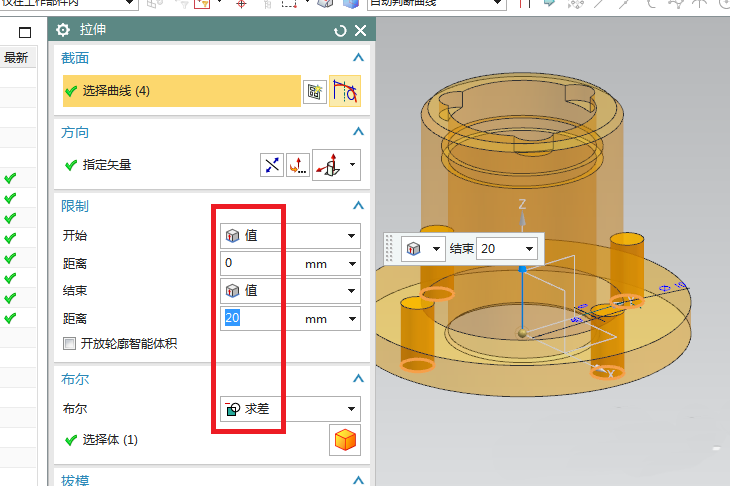 13、如下图所示,回到拉伸对话框,设置限制,0开始,20结束,布尔求差,点击确定。