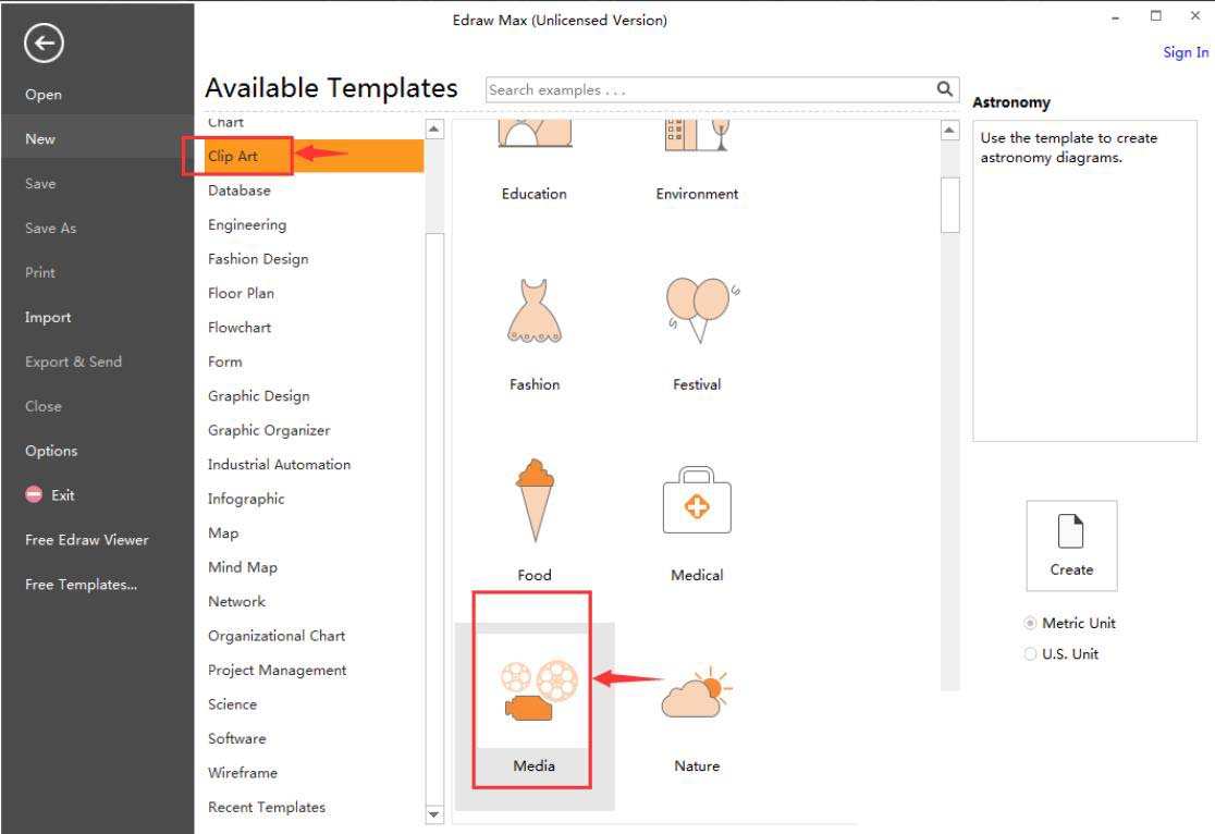 1、打开Edraw Max,在剪切画中双击媒体;2