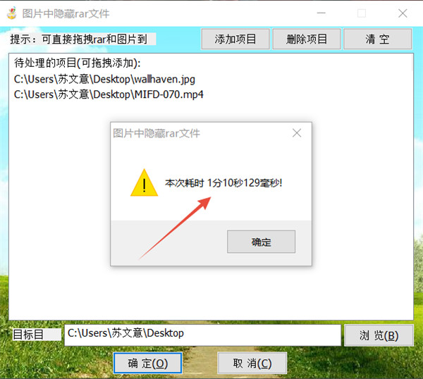 3、处理所耗时长是依据文件大小而定的,基本上100M之内的文件几秒就能完成,趣哥隐藏1.4G的文件耗时1分钟10秒