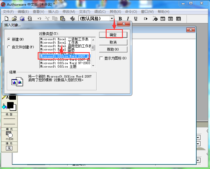 5、在对象类型中点击Microsoft word 2007,按确定;