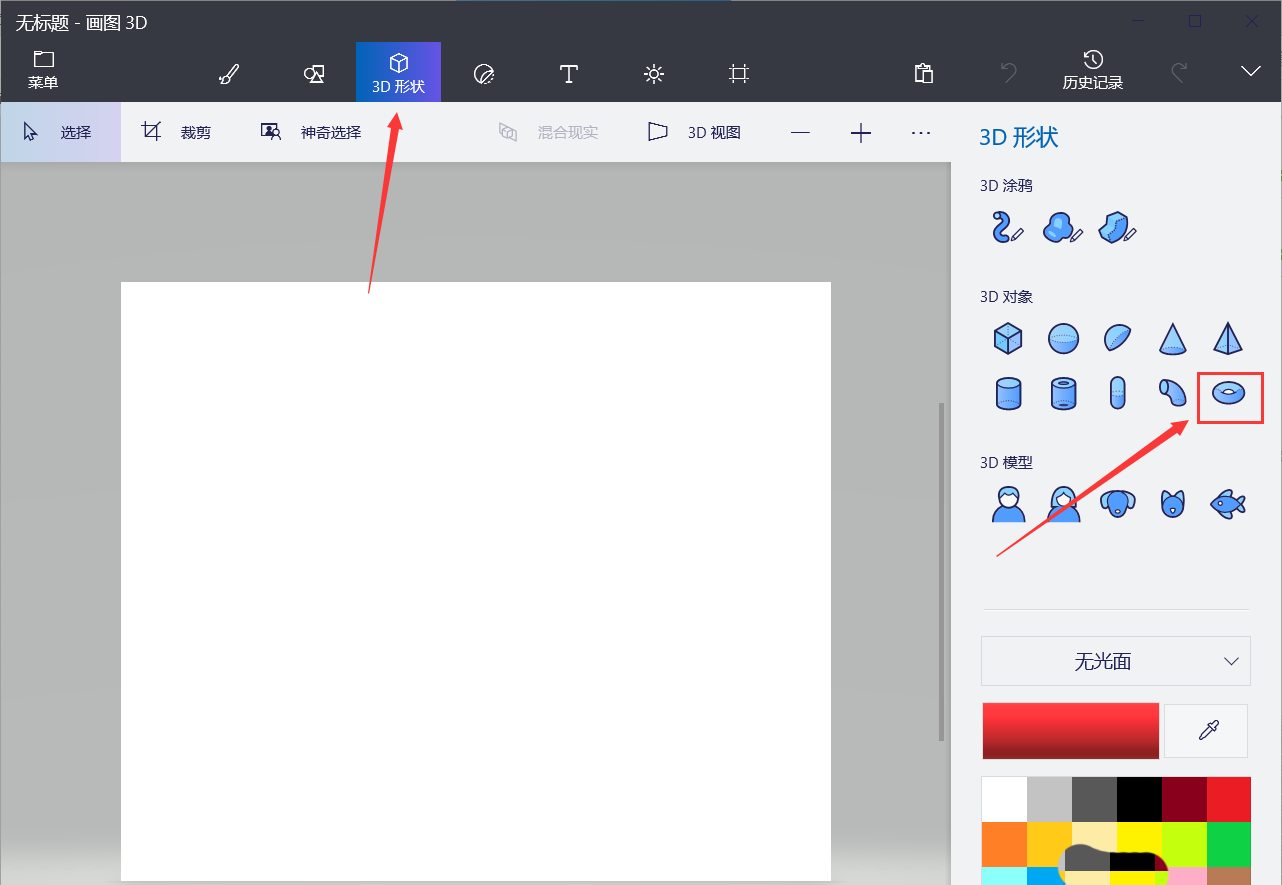 2、点击上方的【3D形状】选择【圆环】。