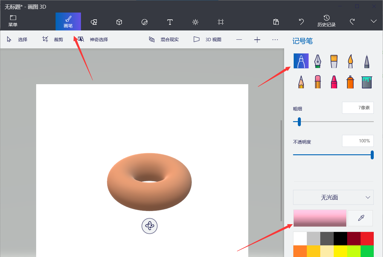 5、点击上方的【画笔】,选择【记号笔】-【粉色】。