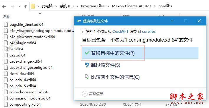 6、复制Crack文件中的licensing.module.xdl64到C:\Program Files\Maxon Cinema 4D R23\corelibs下替换