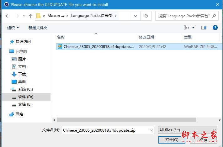打开语言包的位置,选择要安装的.c4dupdate包即可