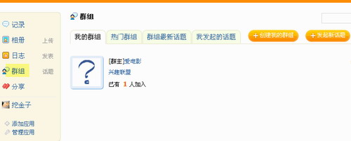 在前台群组页面,可以根据不同的兴趣创建群组、查看热门群组、查看群组最新话题、查看/发起“我的话题”。