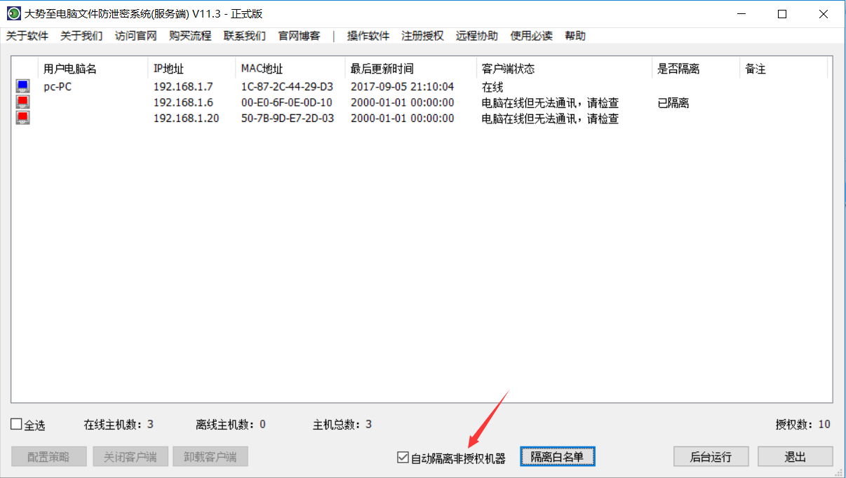 这是一款很不错的管理工具,不但可以用于保护文件安全,防止泄密,还可以用来管理一些上网行为,例如控制聊天软件使用、禁止打开某些网站、禁止安装炒股软件、禁止安装游戏软件、禁止打开视频网站等等,还可以对操作系统进行管理,例如禁止修改IP、禁止修改MAC、禁止键盘的某个功能、禁止打开设备管理器等等。总之,大势至电脑文件防泄密系统(下载地址:www.grablan.com/monitorusb.html)是一款很实用的管理软件。