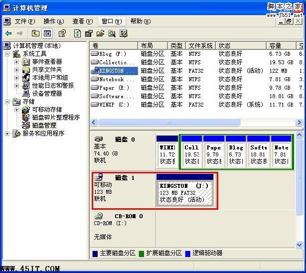 尝试四:到管理工具--计算机管理---磁盘管理下找优盘盘符,删除分区,再建新重新格式化,结果虽找到盘符,但是右键的删除分区根本无法使用,无效