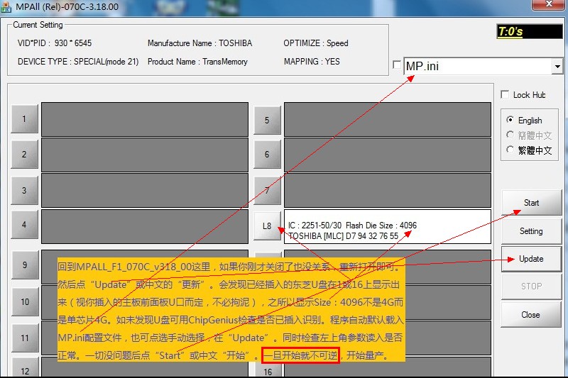 图11、一切没问题后回到量产工具MPALL_F1_070C_v318_00.exe,按图中所示就可以量产了。