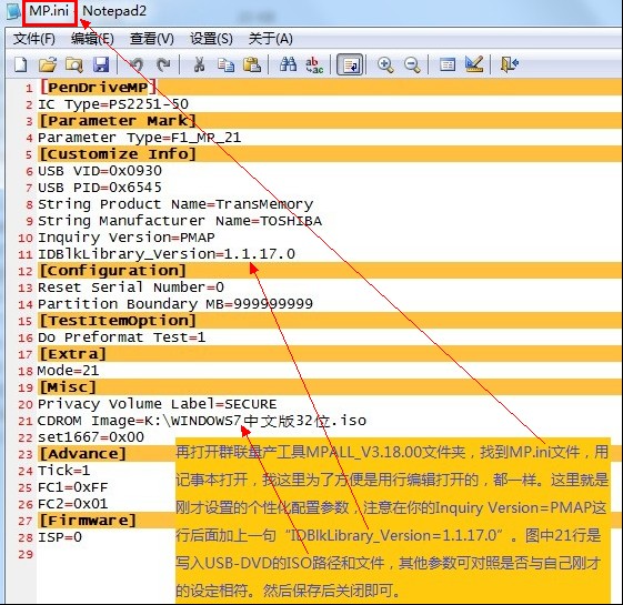 图10、再回到第一张图MP.INI文件,打开后仔细观察你设定的新MP.INI文件内容,尤其是11行容易被遗忘。