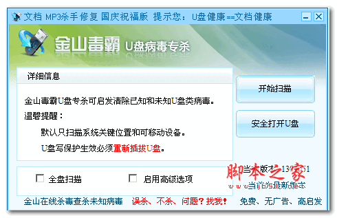 3、打开“金山U盘专杀”,勾选全盘扫描,然后开始扫描。