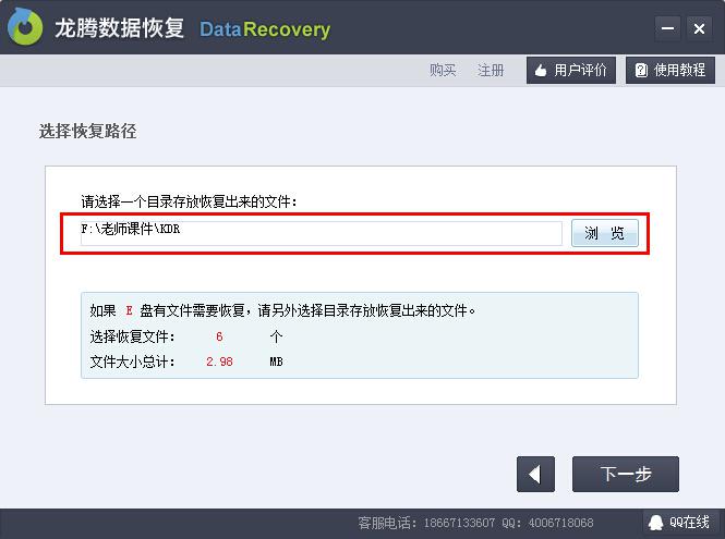 第五步:选择一个盘存放需要恢复出来的文件,然后单击下一步。等待片刻即可恢复完成。