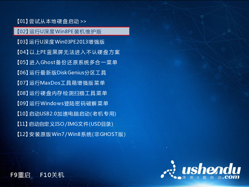 1、将制作好的u盘启动盘连接上计算机,然后开启电脑,在出现开机画面时我们按下一键u盘启动快捷键(详情参考“一键u盘启动快捷键使用教程”)进入u深度主菜单界面,我们利用键盘上的“↑”“↓”方向键来选择我们需要的菜单,这时选择【02】运行u深度Win8PE装机维护版并按下回车键确定进入即可,如下图所示